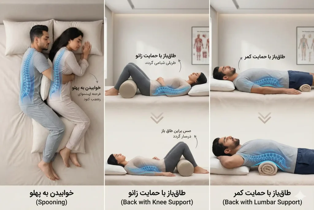 - استفاده از بالش: قرار دادن یک بالش کوچک زیر زانوها وقتی به پشت خوابیدهاید یا زیر لگن، کمر برای حمایت از گودی کمر فشار روی ستون فقرات را به طور چشمگیری کاهش میدهد.